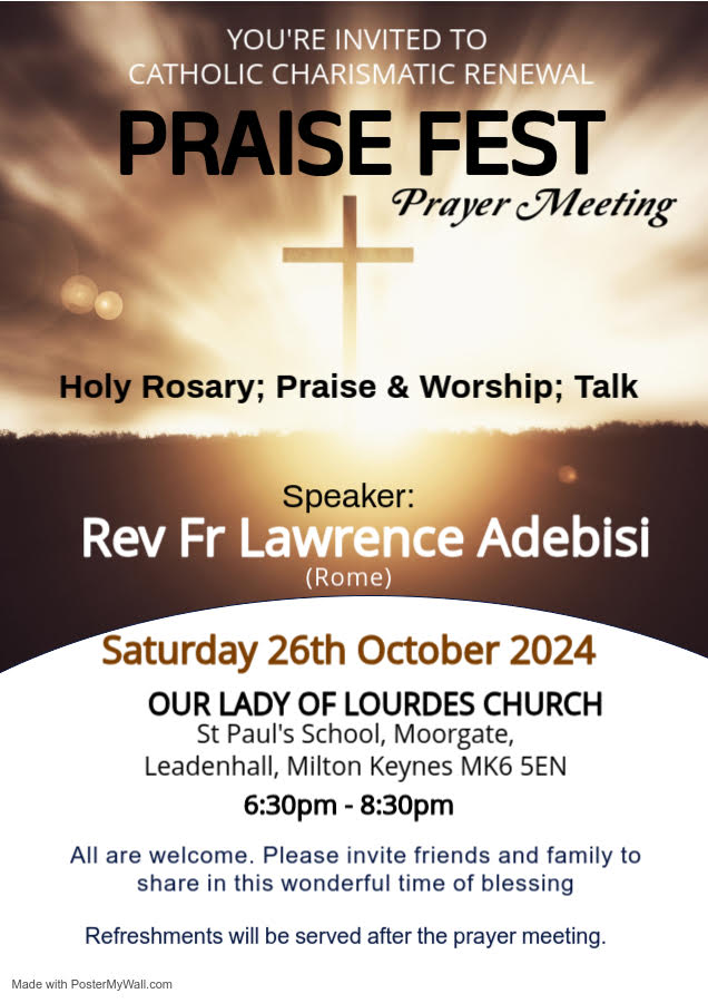 Praise Fest Prayer Meeting on Saturday 26th October 6.30pm to 8.30pm Our Lady of Lourdes Church, St Paul’s School